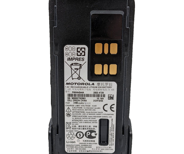 The Motorola PMNN4544A is a high-capacity 2450mAh, IP68-rated Lithium-Ion battery designed to provide long-lasting power and exceptional durability for a wide range of Motorola two-way radios. Featuring advanced IMPRES technology, this battery offers intelligent charging and reconditioning capabilities when used with an IMPRES charger, ensuring optimal performance, maximized talk time, and an extended lifespan for your device.